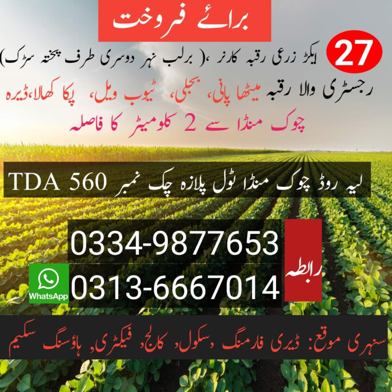 تحصیل چوک سرور شہید (چوک منڈا ) ضلع کوٹ ادو(پنجاب) میں انویسٹمنٹ کرنے کا شاندار اور سنہری موقع – سنہری موقع برائے ہاؤسنگ سوسائٹی ،فیکٹری، سکول کالج, فارم ہاؤس, شہری حدود والا رقبہ 27 ایکڑ زری رقبہ کارنر والا جس کے ایک طرف نہر اور دوسری طرف پختہ سڑک ہے۔ پانچ ایکڑ فرنٹ سڑک پر جبکہ چھ ایکڑ فرنٹ نہر والی طرف ہے – فرد ملکیت والا رقبہ ہے۔موقع پر انتقال کوئی بینک کا قرضہ نہ ہے. ڈیرہ ،پکا کھالا، ٹیوب ویل کی سہولت کے ساتھ۔بجلی کی سہولت موجود مین روڈ مظفرگڑھ میاں والی ایم ایم روڈ (لیہ روڈ)چوک منڈا ٹول پلازہ سے بائیں ہاتھ مڑ کے ایک کلومیٹر پر پختہ سڑک پر واقع لاٹ نمبر 16 چک نمبر TDA 560 ( نزد جمال باغ روحانی درس )