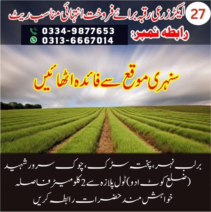 27 Acres Agri Land For Sale – Golden Opportunity to invest in Chowk Sarwar Shaheed ( Chowk Munda ) District Kot Addu – Contact # 03349877653 , 03136667014
